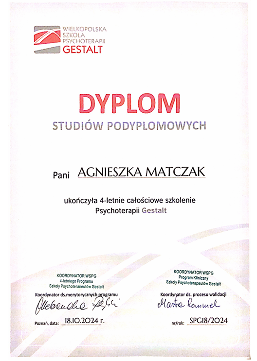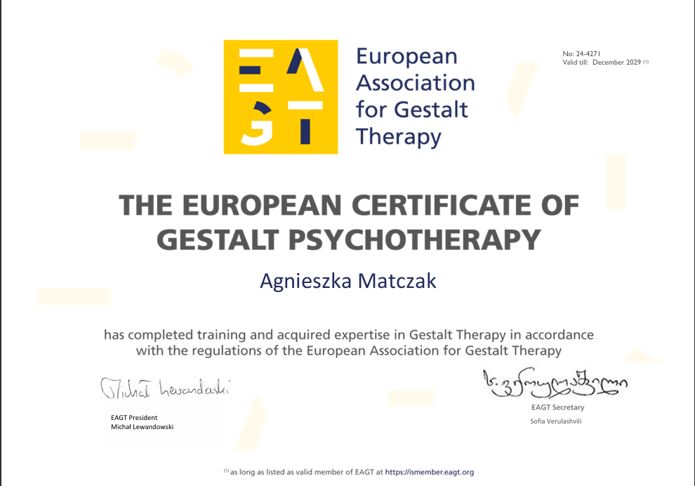 Jestem psychoterapeutką i prowadzę terapię online, dzięki czemu możesz skorzystać ze wsparcia tam, gdzie czujesz się najbardziej bezpiecznie. Pracuję w nurcie Gestalt, który koncentruje się na tym, co przeżywasz tu i teraz – na Twoich emocjach, potrzebach i relacjach. Towarzyszę Ci w lepszym rozumieniu siebie, odzyskiwaniu kontaktu ze sobą i wprowadzaniu realnych zmian w codziennym życiu. Pracuję z uważnością, bez ocen i bez gotowych recept.